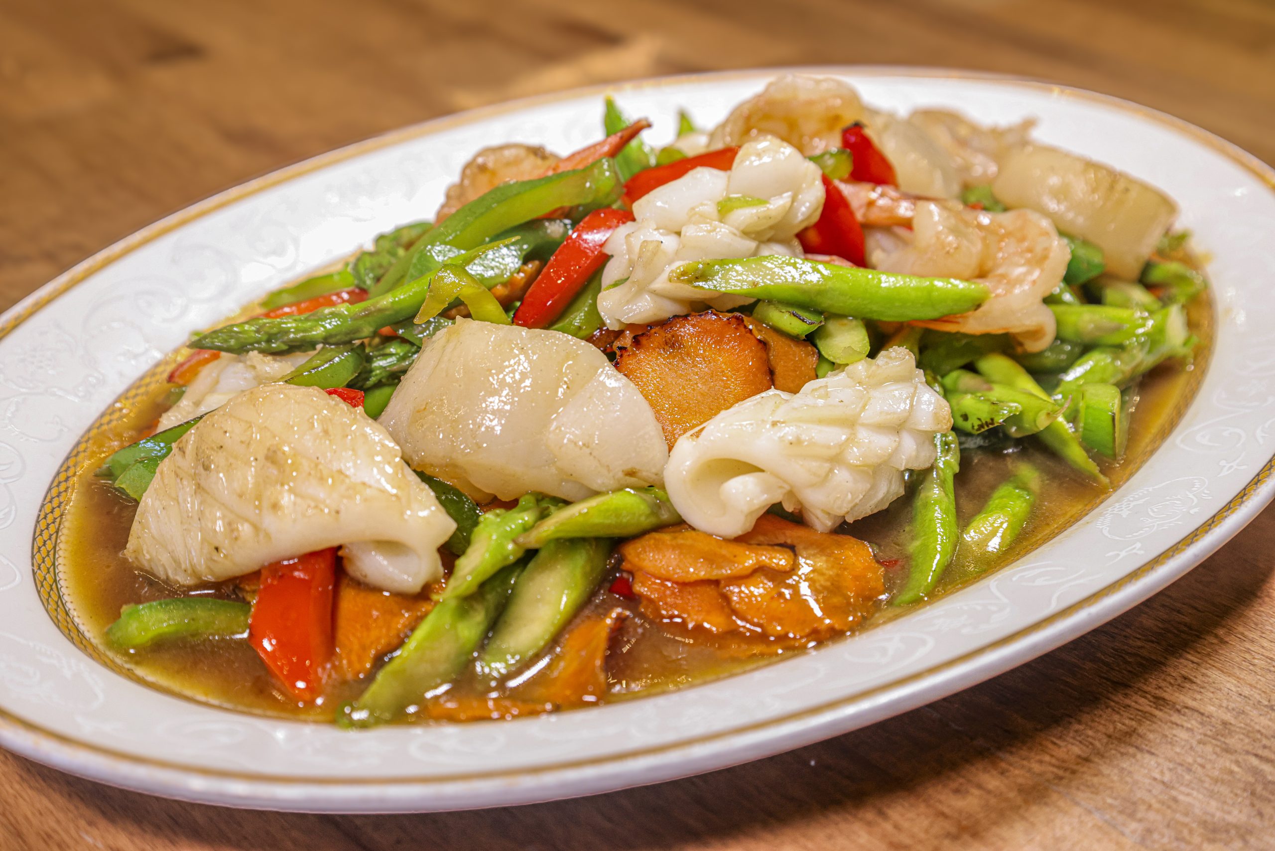 Sauteed, fresh asparagus nixed with shrimp, scallops, calamari, and carrots in a homemade chili and garlic sauce.