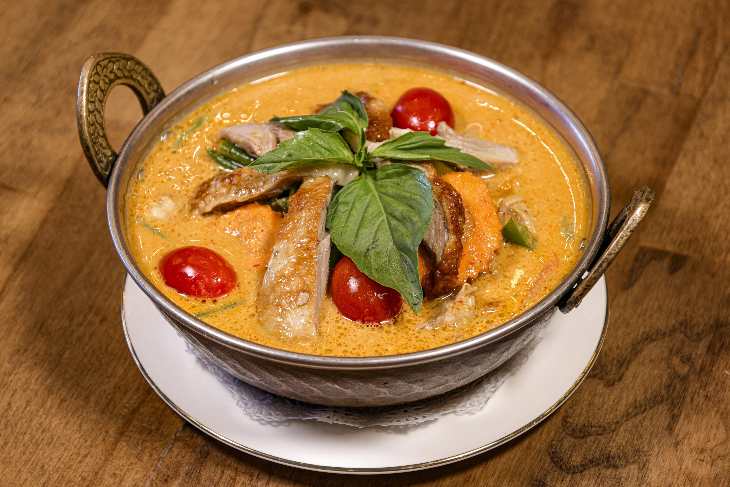Roasted duck in a red curry with coconut milk, tomatoes, bamboo shoots, pineapple, bell peppers, and basil leaves.